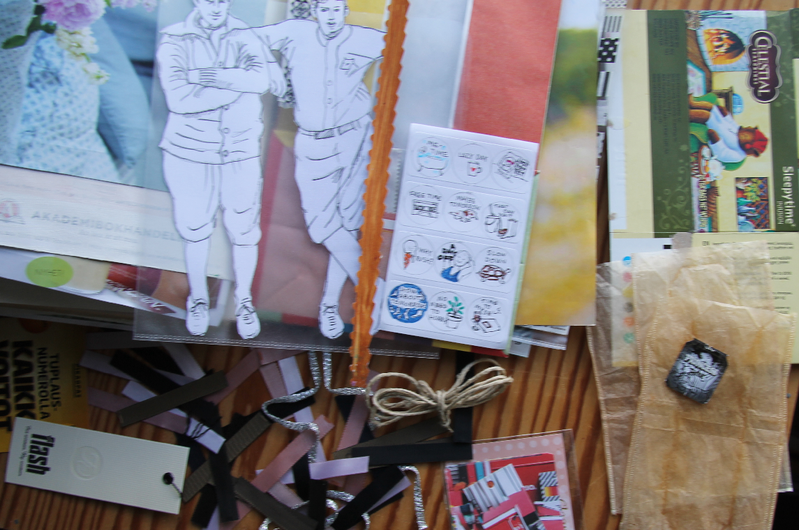 There's also more paper, among others a page from IKEA instructions, backside of a security envelope (that's as fancy as it gets here.), an IKEA measuring tape, a lid from KESO (cottage cheese) can, a Finnish betting list, some strips of paper lace and a cover of a composition book with Minnie Mouse on it. And the potato chip bag. The turquoise one with hearts on it.